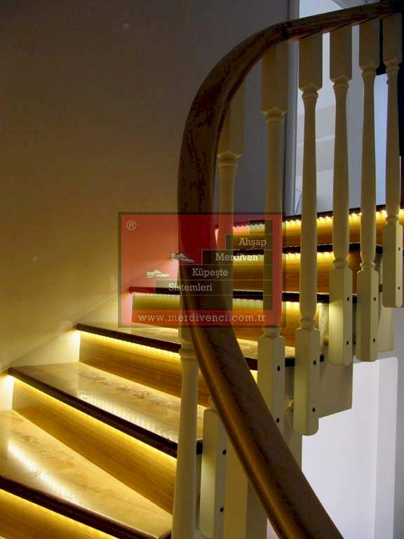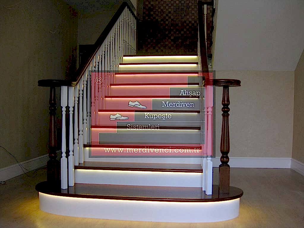 Led aydınlatmanın oldukça şık görünebileceği modellerden biri ahşap basamak ile paslanmaz korkuluk ve küpeştenin bir araya geldiği modern merdivenlerdir. Mimari proje merdivenin korkuluklu olarak değil de iki duvar arasında yapılmasını gerektiriyorsa, led aydınlatmalardan bu durumda da yararlanılmaktadır. Zira korkuluk ve küpeşte, merdivenin görünümüne estetik katan unsurlardır ve bunlardan birinin yokluğunda azalacak olan etkiyi led aydınlatma ile telafi etmek mümkündür.